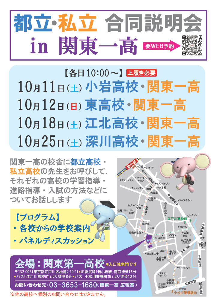 本校に都立高校の先生をお呼びして合同説明会を行います。10月11日(土) 都立小岩高等学校10月12日(日) 都立東高等学校10月18日(土) 都立江北高等学校10月25日(土) 都立深川高等学校プログラム・各校からの学校案内・パネルディスカッションパネルディスカッションでは皆さまからのご質問にお答えします。予約はこちらから。皆さまのご来校をお待ちしております。