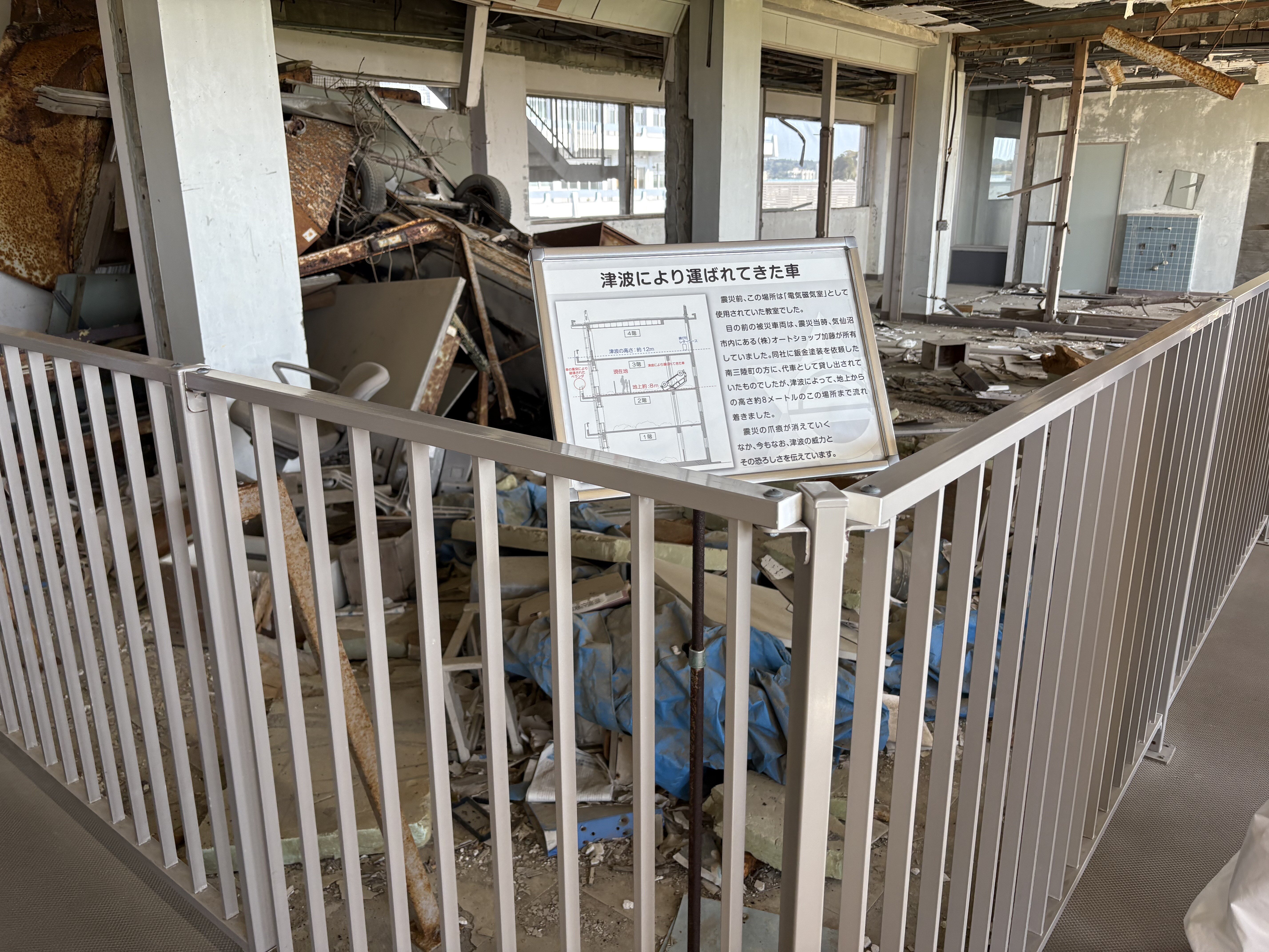気仙沼伝承館を訪問いたしました。伝承館は、気仙沼向洋高校旧校舎を被災当時のまま保存したもので、実際に建物に立ち入って見ることができる貴重な場所です。4階建ての校舎の3階に津波で押し流されてきた車が残っていたり、当時の津波の破壊力をまた肌で感じることができました。