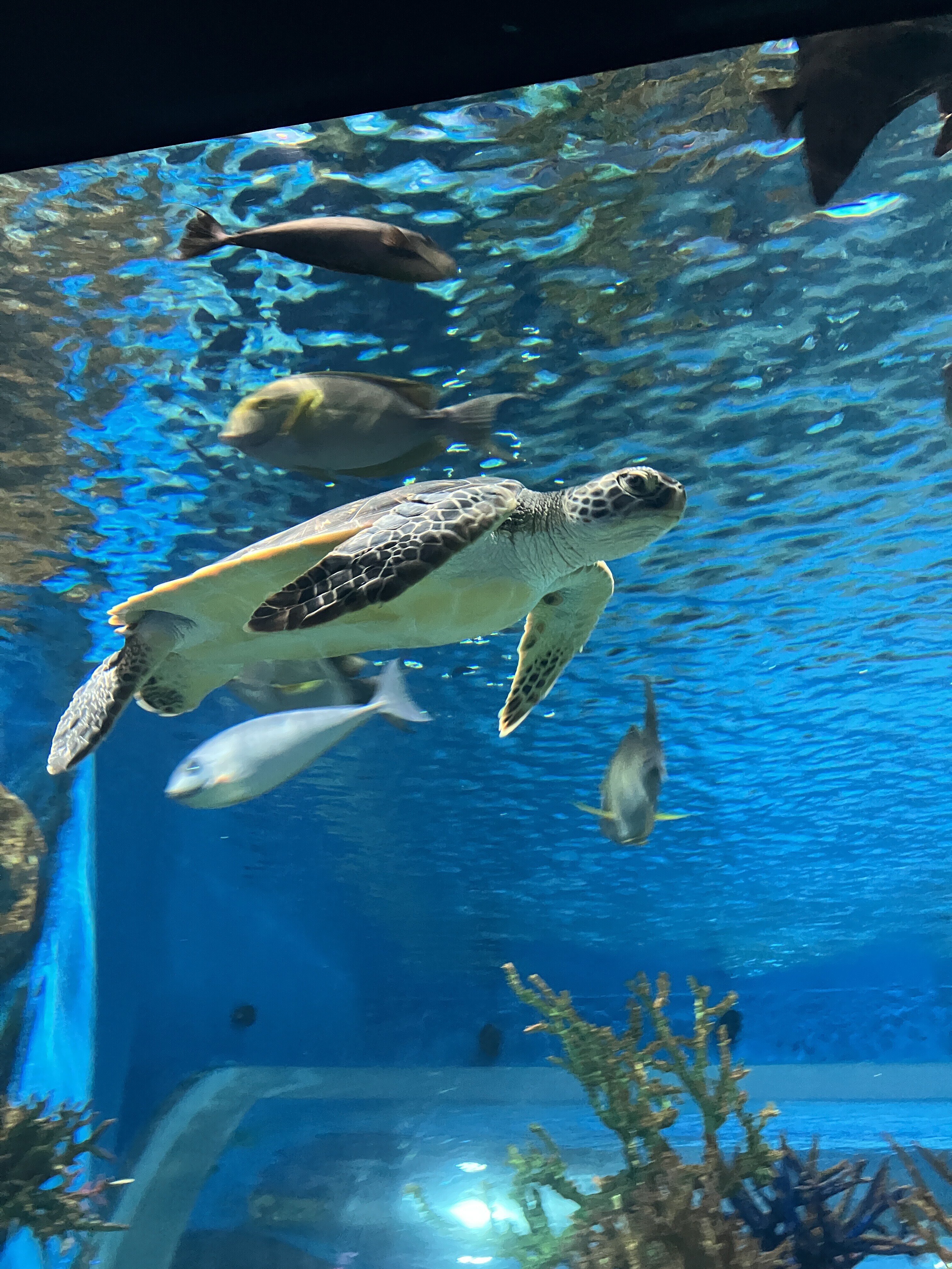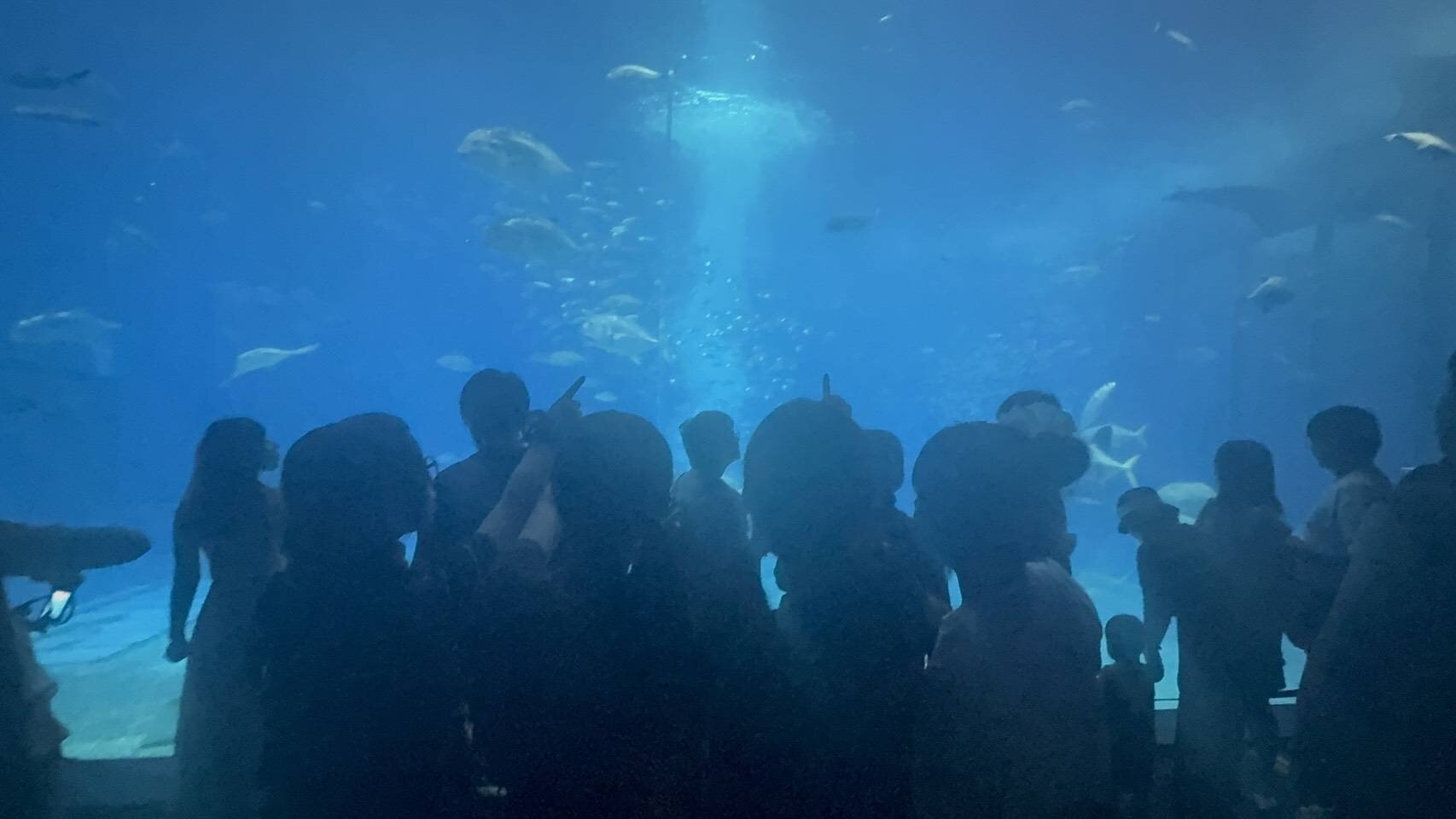 午後は、美ら海水族館を訪問しました。みんなで超巨大水槽を見上げました。