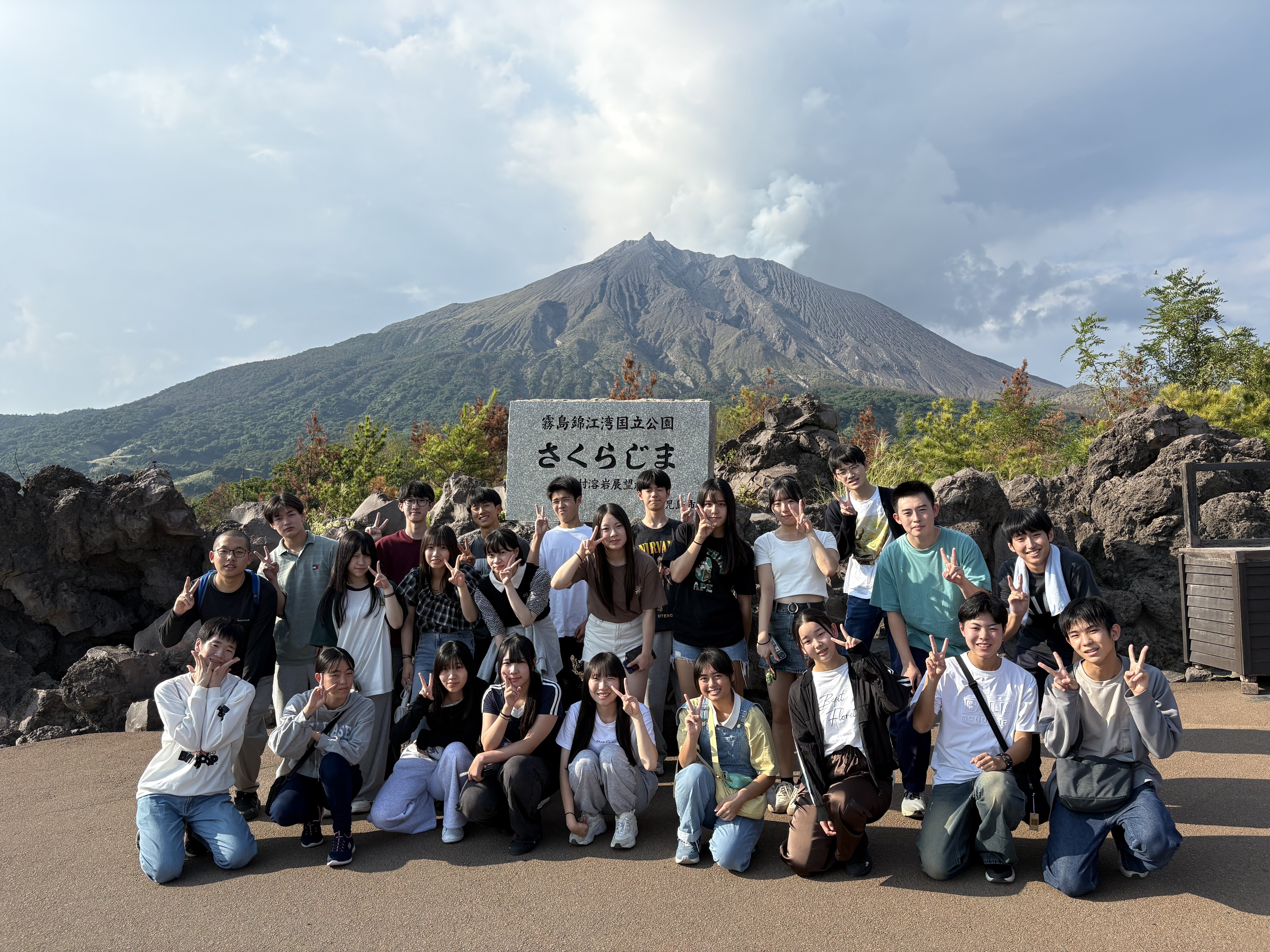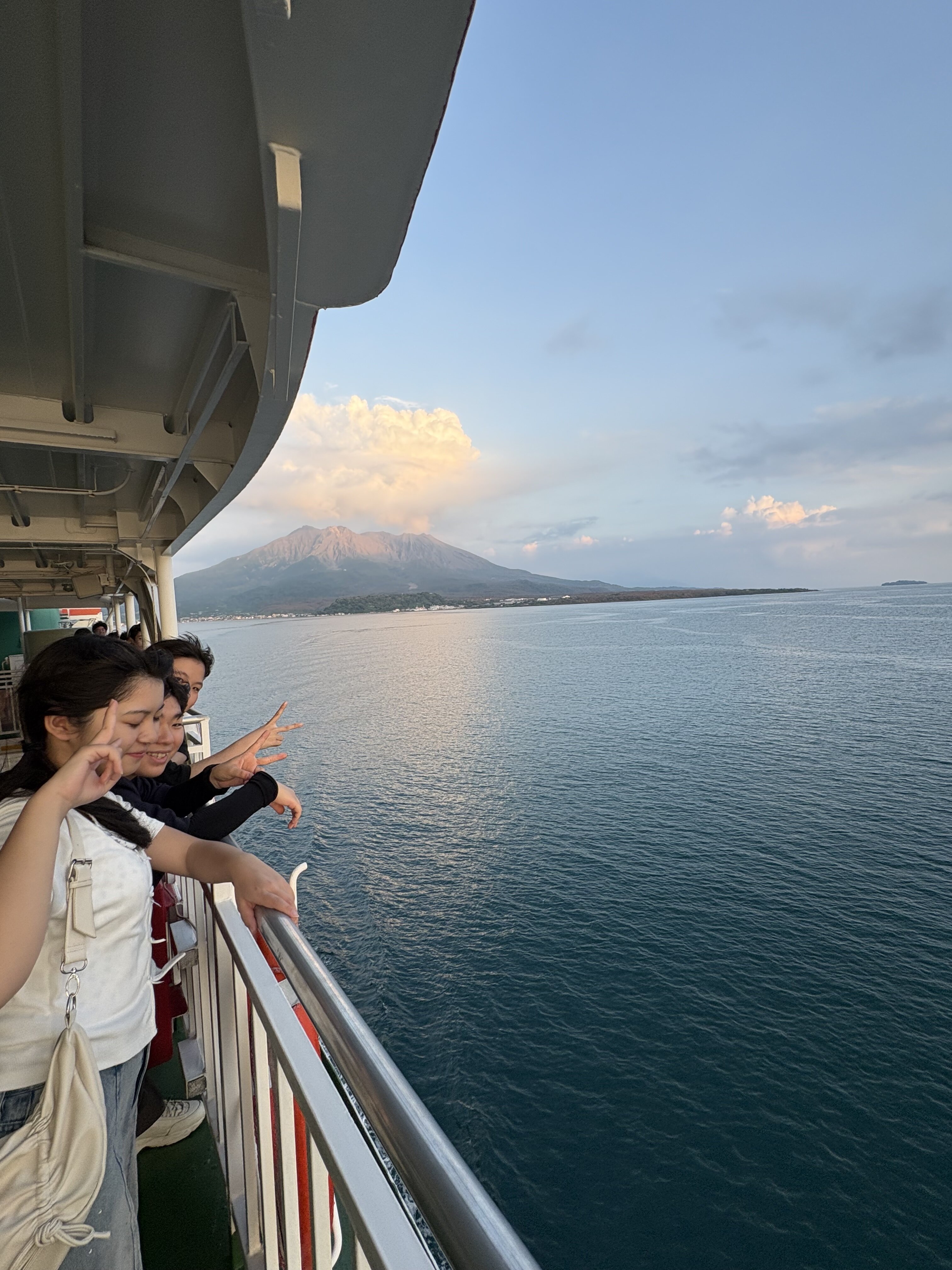 2日目の離村式後には、桜島に向かい、大正噴火で埋没してしまった鳥居をはじめ、有村溶岩展望台、火の島めぐみ館、桜島ビジターセンターを見学し、火山と共に暮らす上での大切な教訓を学びました。晴天に恵まれくっきりと浮かぶ雄大な桜島を眺めながら、バスごと桜島フェリーに乗って鹿児島市に入りました。