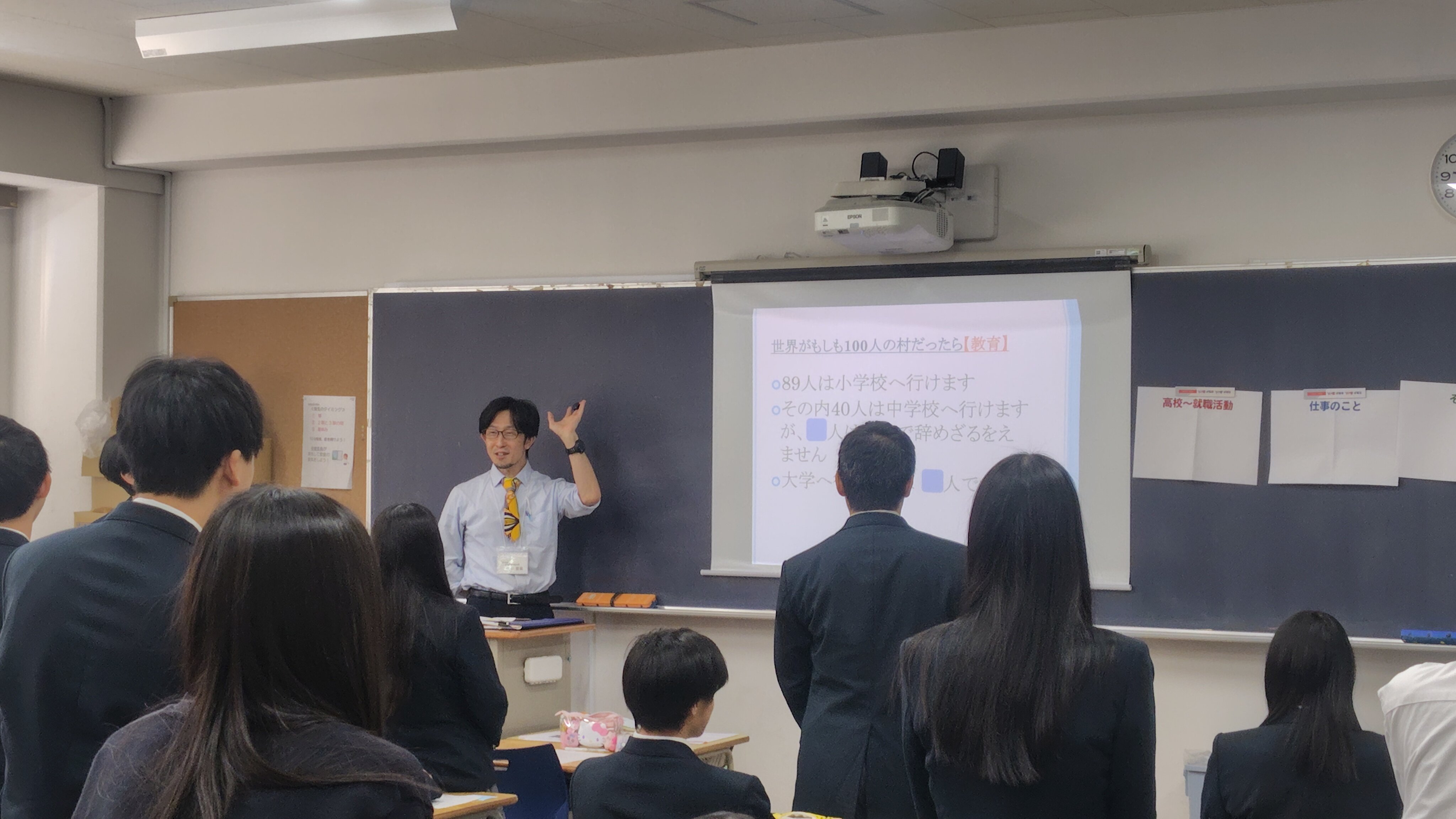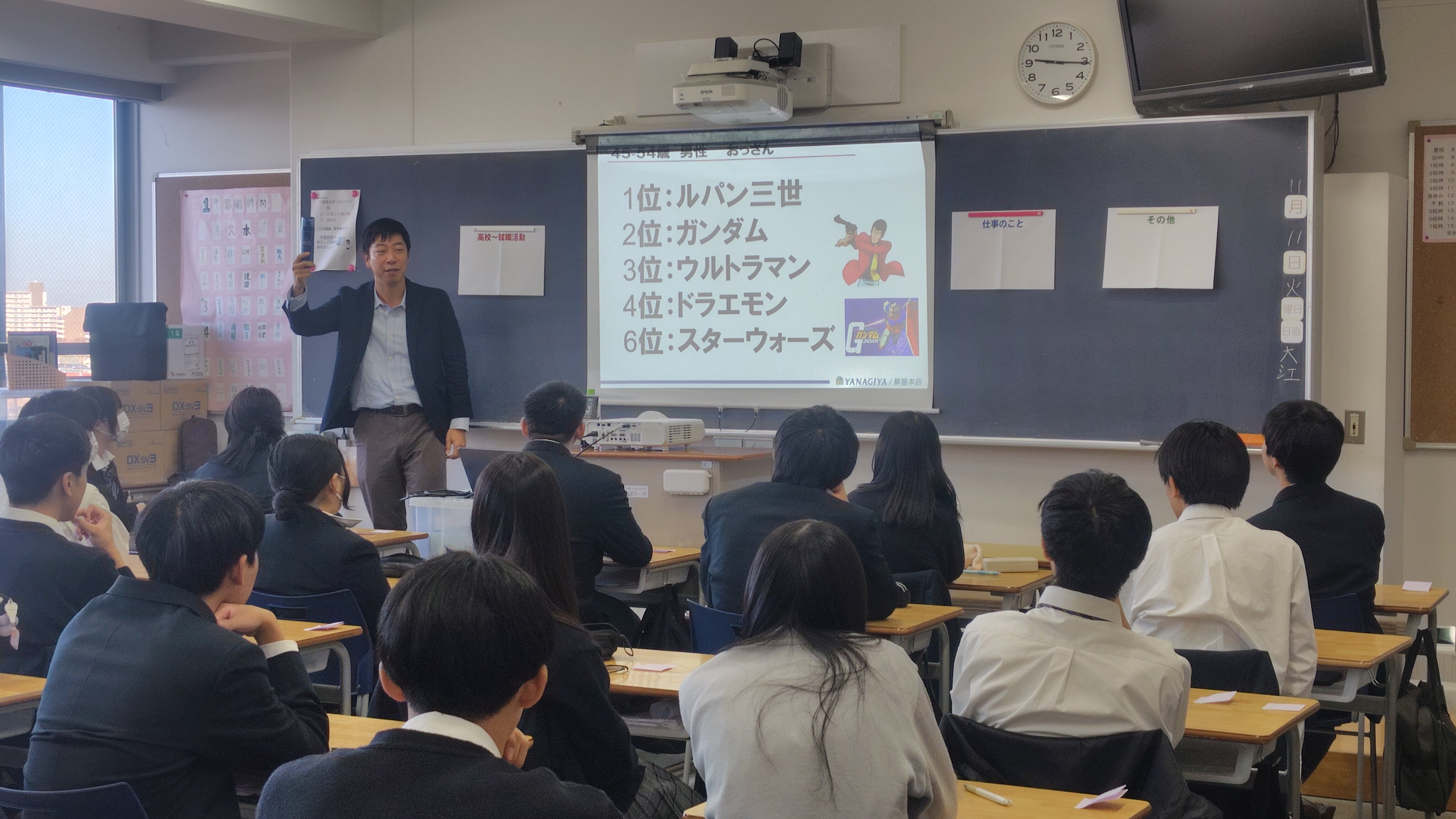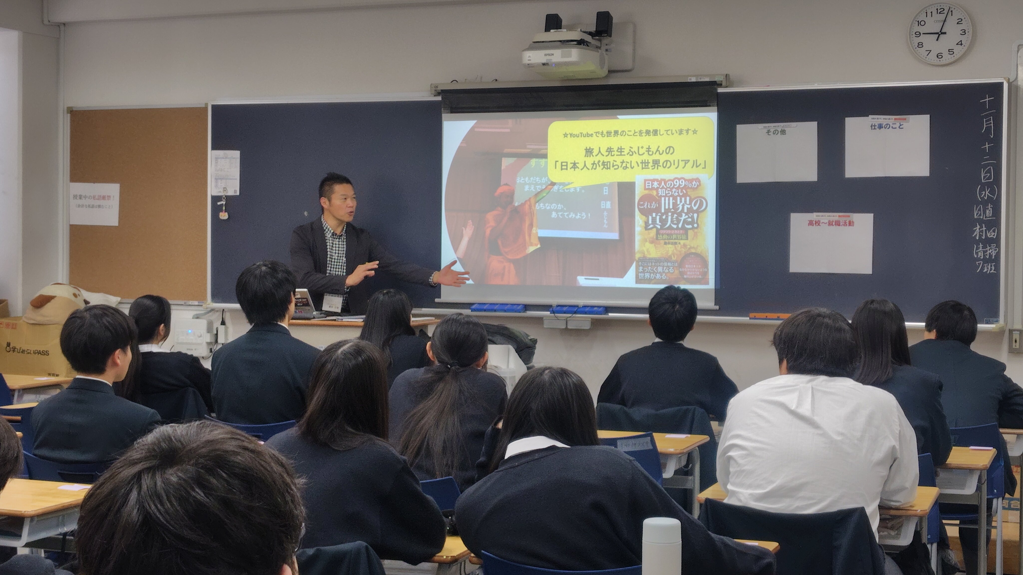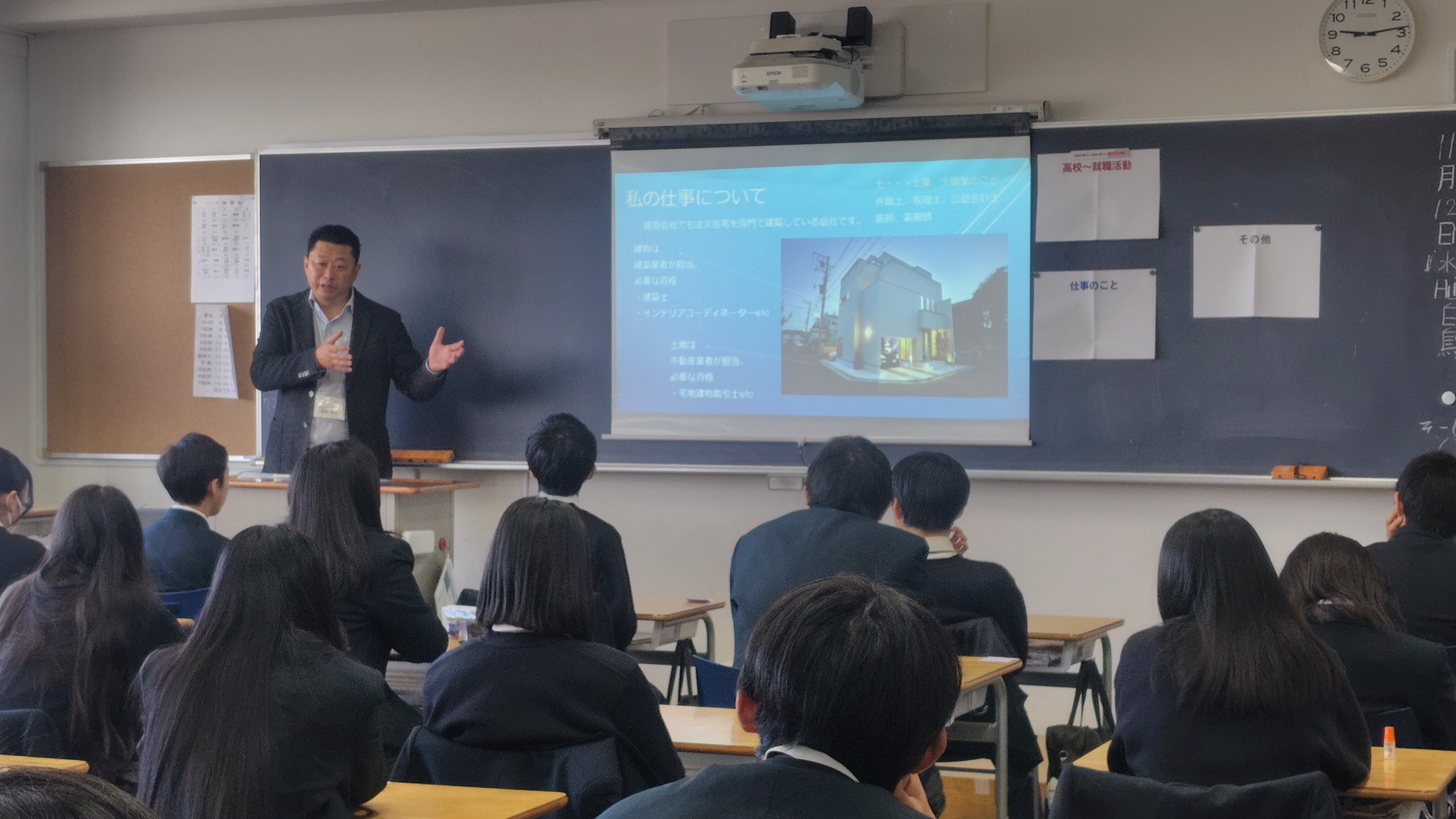 11月12日(水)1学年対象に、本校実施11年目となる「16歳の仕事塾」を実施しました。現役で活躍する社会人講師2名による講話を各教室で行い、職業の話はもちろん、学生時代の話や文理選択・進路選択など講師が人生の中で大切にしていることや、未来をイメージすることの有益さや失敗を成功につなげる方法、人生感についてもお話しいただきました。
