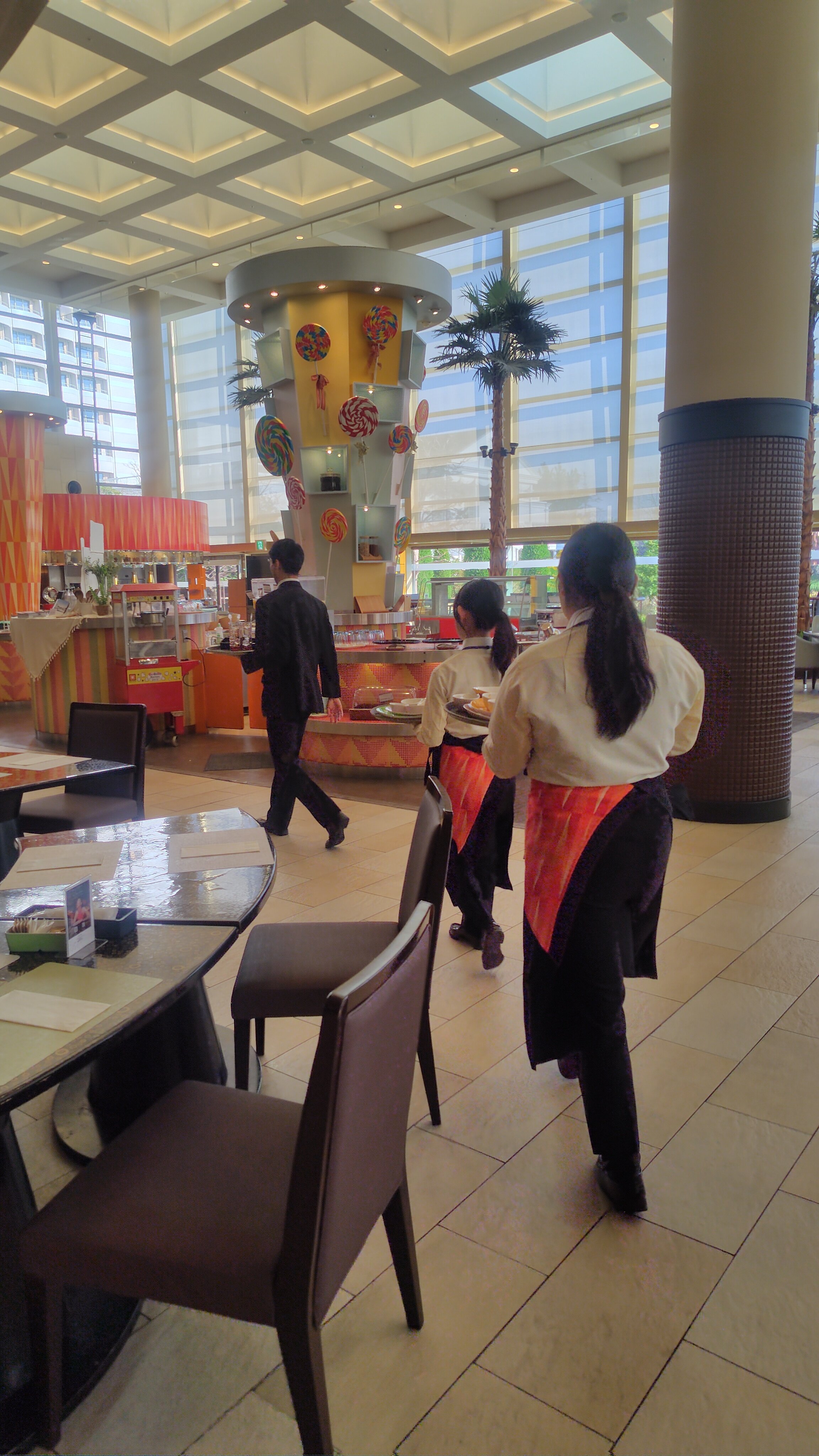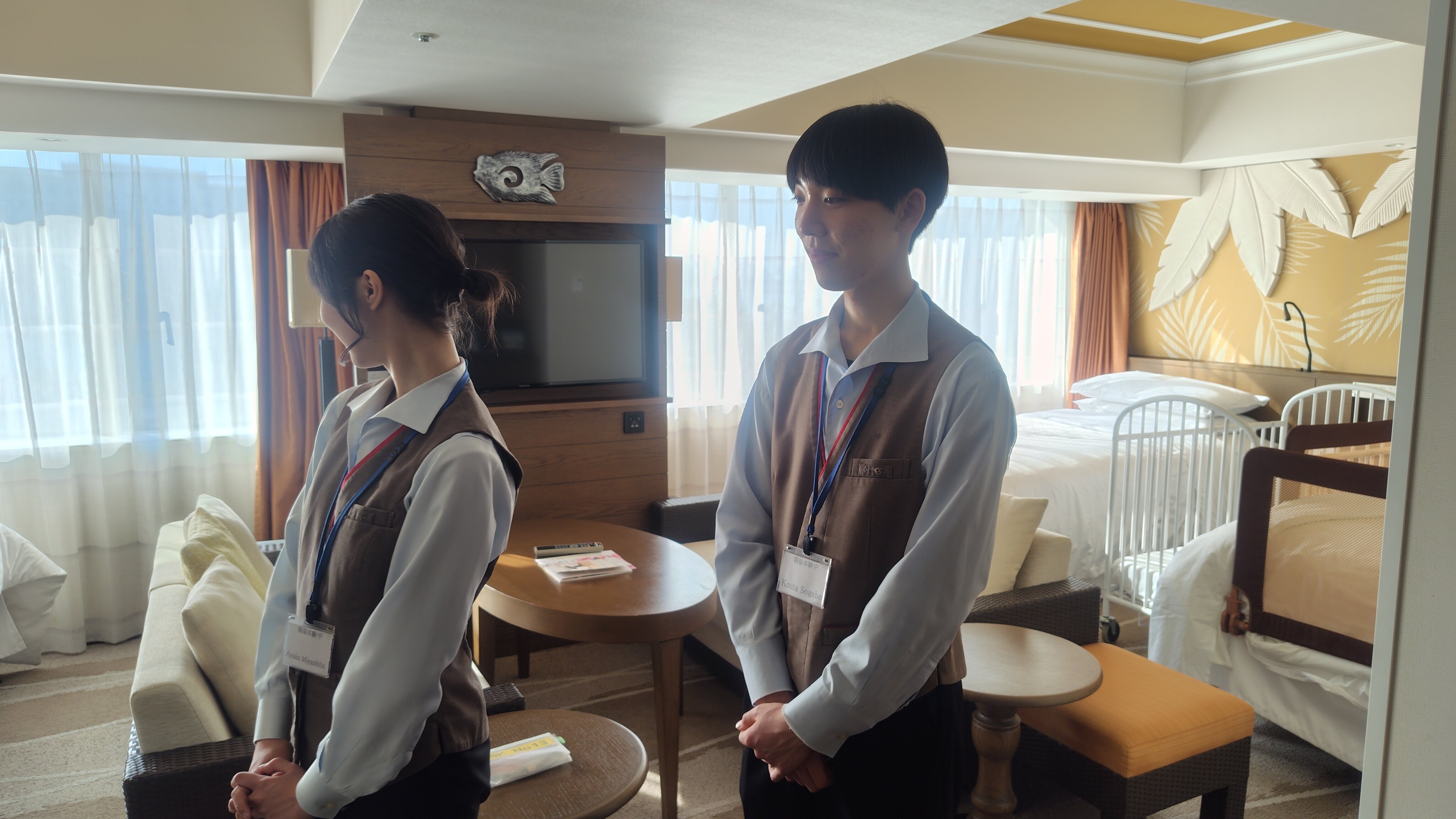 私は、将来ホテリエになって人を幸せにすることに携わりたいと考えています。そのために、今回の経験は将来にも生かせると思い参加させていただきました。まず私は、館内にある「グランカフェ」でカクテル作りや検食を体験させていただきました。検食では、定期的に変わるメニューの味や特徴を、自信を持ってお客様に伝えられるようにするための重要な仕事だと知ることができました。また、レストランでは余った食材を家畜の餌などに再利用して環境に配慮したり、食事に制限がある人にも対応したりと様々な工夫が凝らされていました。そして、館内では笑顔で親しみやすいスタッフが多く、スタッフの有志で館内演奏を行っていたりとスタッフの方々も楽しく働いている姿が印象的でした。また、ホテルはテーマパークの近くで外国人のお客様も多く、クラブラウンジでは内装やBGMなども安心感を生み出す工夫もされています。今回の研修を通して、多くの人が安心して親しみやすく、気持ちよく過ごすことができるホテルだと思いました。