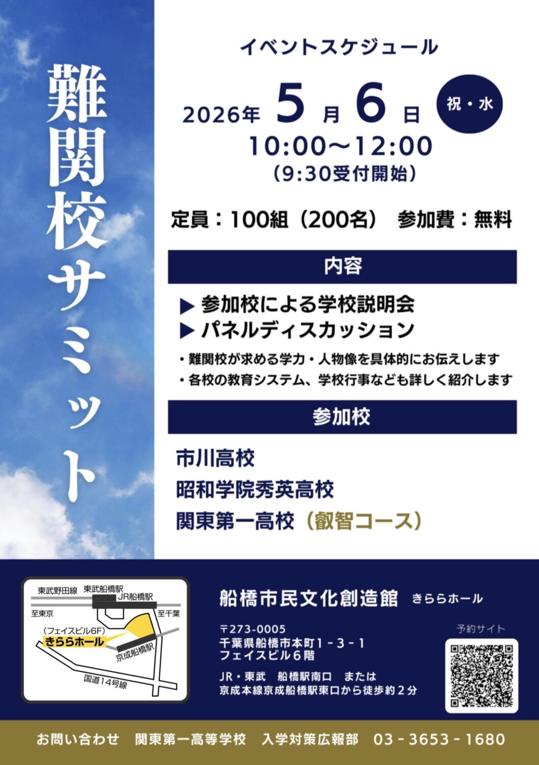 この度、船橋フェイス(船橋FACE)にて、千葉を代表する進学校である市川高校、昭和学院秀英高校、そして2027年に新設される関東第一高等学校「叡智コース」による合同進学フェア「難関校サミットin船橋」を開催いたします。