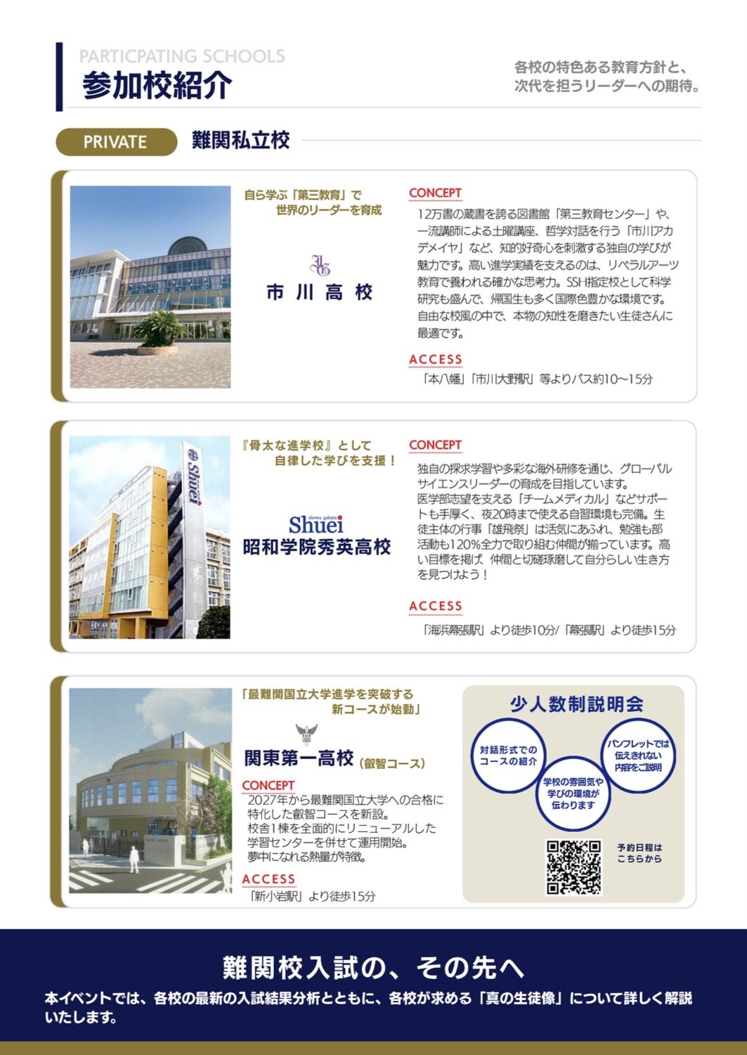 本イベントでは、長年、高い進学実績を築き上げてきた伝統校である市川高校、昭和学院秀英高校の教育力と、新たに「学校完結型」の最先端プログラムを掲げて始動する関東第一高校の新コースの挑戦を、多角的な視点から比較・検討いただけます。